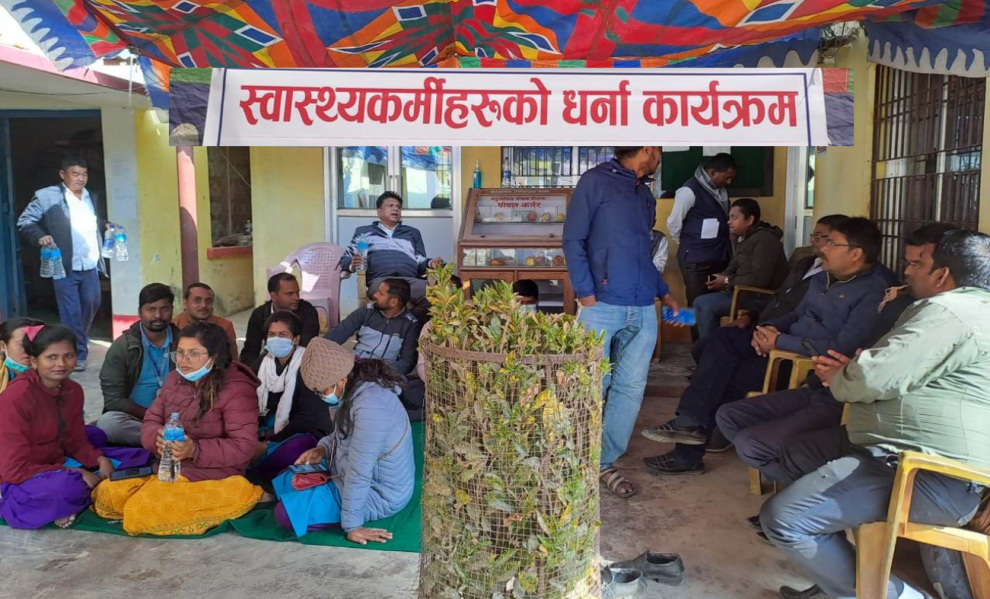 उक्त माग सम्बोधन नहुदा धर्नामा बस्न बाध्य भएको इमर्जेन्सीका इन्चार्ज श्यामसुन्दर साहले जानकारी दिए । स्वास्थ्यकर्मीहरुले पहिलो चरण अन्तर्गत फागुन २ गते देखि ५ गतेसम्मको विभिन्न माँग राखी ४ दिने आन्दोलनका कार्यक्रम सार्वजनिक गरेका छ्न ।