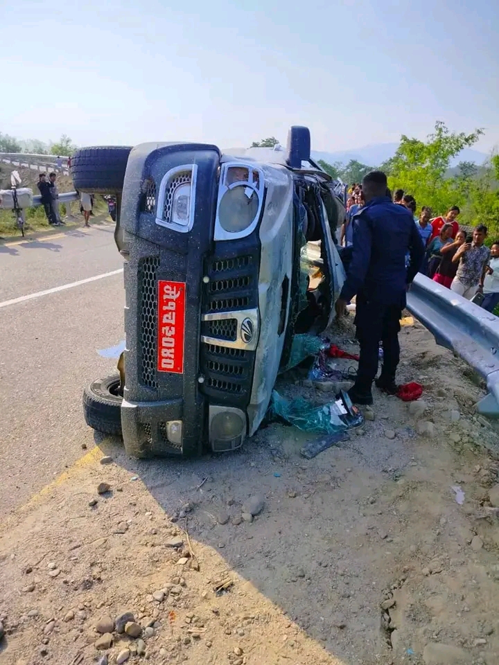 स्कारपियो गाडी अनियन्त्रित भइ सडकको साईडमा लगाएको फलामको बेरियरमा ठोक्किएको प्रहरीले जनाएको छ ।