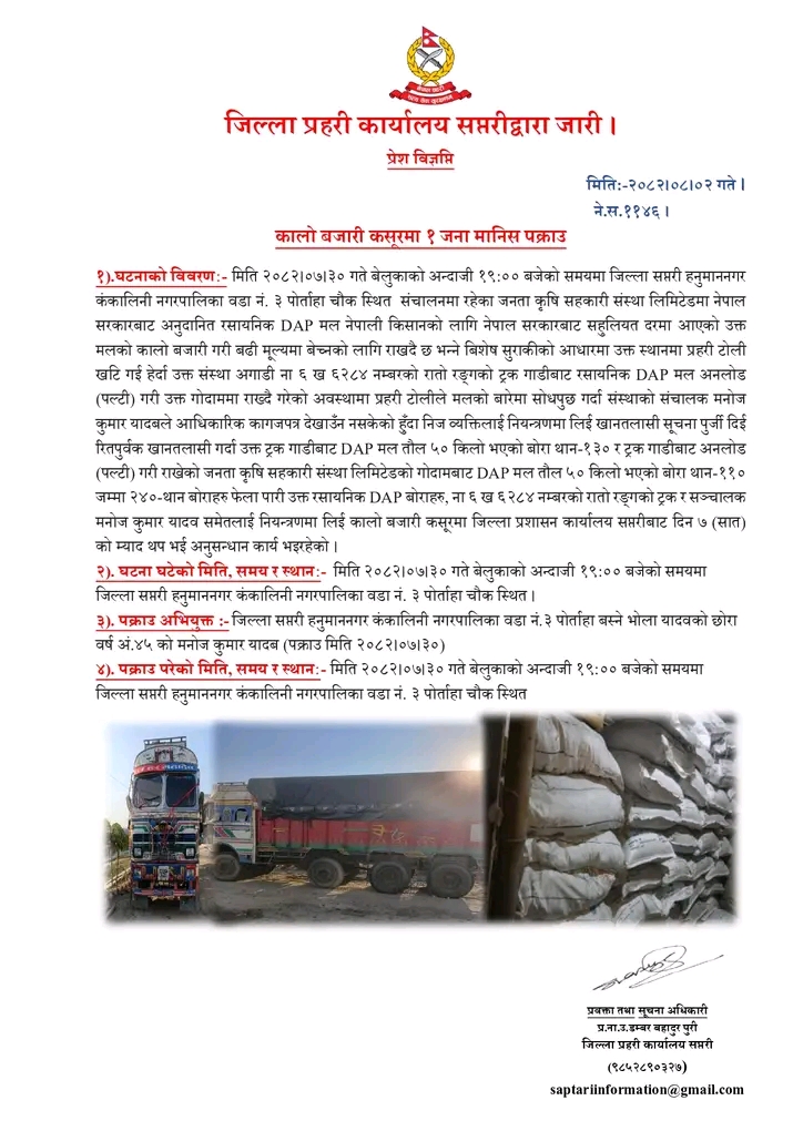 यादवले संचालन गरेको जनता कृषि सहकारी संस्था लिमिटडमा नेपाल सरकारबाट अनुदातित रासायनिक डिएपी मल कालाबजारी गरेको सुराकीको आधारमा ना ६ ख ६२८४ नम्बरको ट्रकसहित २ सय २० बोरा मल बरामद भएको जिल्ला प्रहरी कार्यालय सप्तरीले जनाएको छ ।
