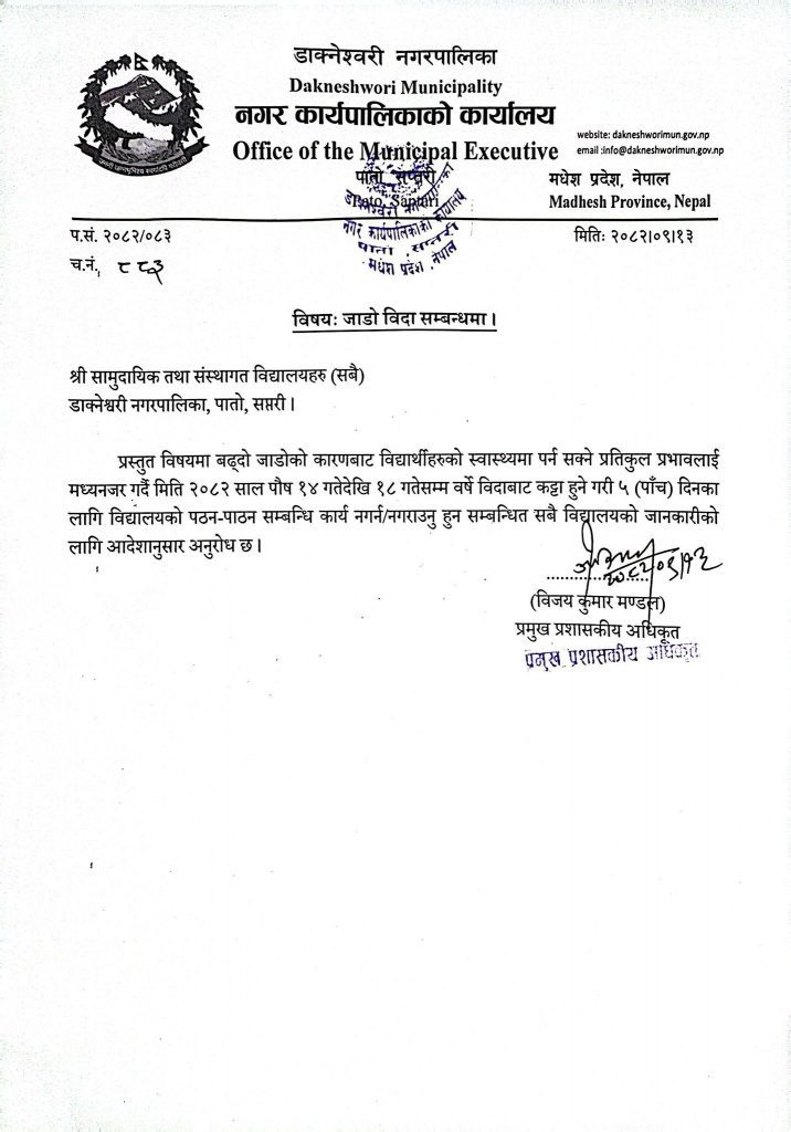 कञ्चनरुप, १३ पुस । सप्तरीको डाक्नेश्वरी नगरपालिकाले जाडो बढ्न थालेपछि पाँच दिनका लागि विद्यालय बिदा दिएको छ । निरन्तरको चिसो हावा, शीतलहर, बाक्लो कुहिरो र हुस्सुले जनजीवन प्रभावित हुन थालेपछि डाक्नेश्वरी नगरपालिकाले विद्यालय बिदा दिने निर्णय गरेको हो ।