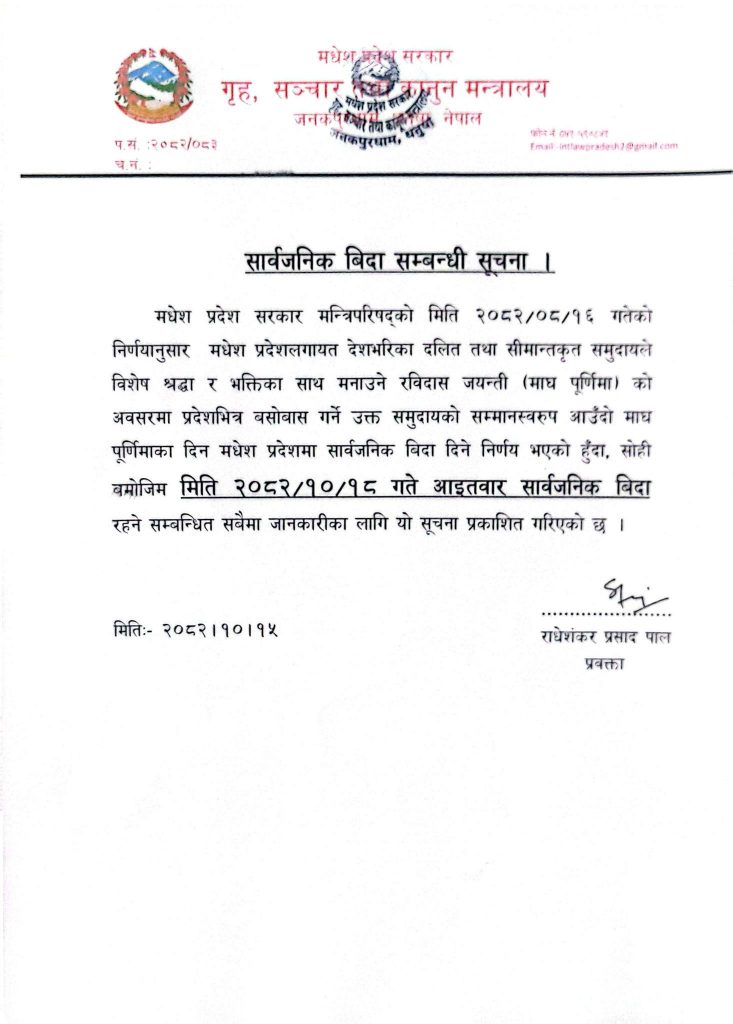 सूचनामा मधेस प्रदेशसहित देशभरका दलित तथा सीमान्तकृत समुदायले विशेष श्रद्धा र भक्तिका साथ मनाउने रविदास जयन्ती (माघ पूर्णिमा) को अवसरमा प्रदेशभित्र बसोबास गर्ने उक्त समुदायप्रति सम्मान व्यक्त गर्न सार्वजनिक बिदा दिने निर्णय गरिएको उल्लेख गरिएको छ।