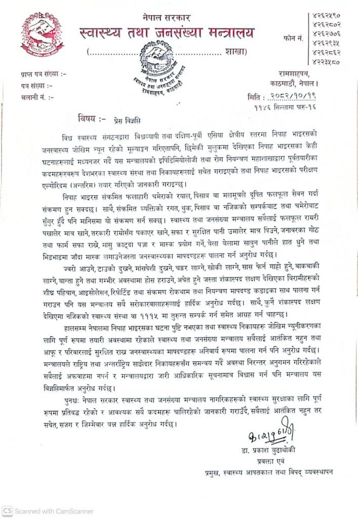 स्वास्थ्य तथा जनसंख्या मन्त्रालयका प्रवक्ता डा. प्रकाश बुढाथोकीद्वारा जारी विज्ञप्तिमा नागरिकलाई सचेत, सतर्क र जिम्मेवार रहन आग्रह गरिएको छ।