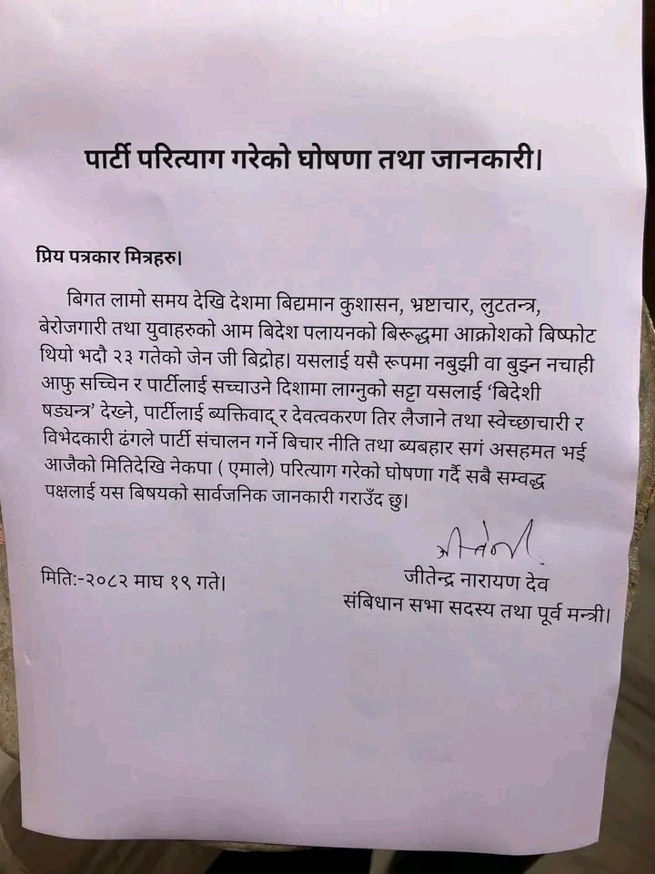 कञ्चनरूप, १९ माघ । संविधानसभा सदस्य तथा पूर्व मन्त्री जितेन्द्र नारायण देवले नेकपा एमाले परित्याग गरेको घोषणा गर्नुभएको छ । शनिबार सार्वजनिक गरिएको लिखित घोषणामार्फत उहाँले पार्टी परित्यागको औपचारिक जानकारी दिनुभएको हो ।