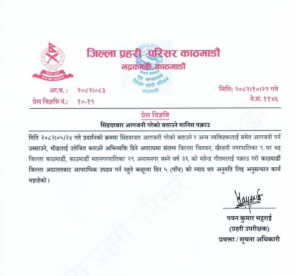 जिल्ला प्रहरी परिसर काठमाडौंका अनुसार प्रदर्शनको क्रममा सिंहदरबारमा आगजनी गरेको भन्दै उक्साउने तथा भिडलाई उत्तेजित बनाउने अभिव्यक्ति दिँदै आपराधिक गतिविधिमा संलग्न भएको आरोपमा चितवन जिल्ला खैरहनी नगरपालिका–९ घर भई हाल काठमाडौं महानगरपालिका–२९ अनामनगर बस्दै आएका वर्ष ३६ का महेन्द्र गौतमलाई पक्राउ गरिएको हो ।