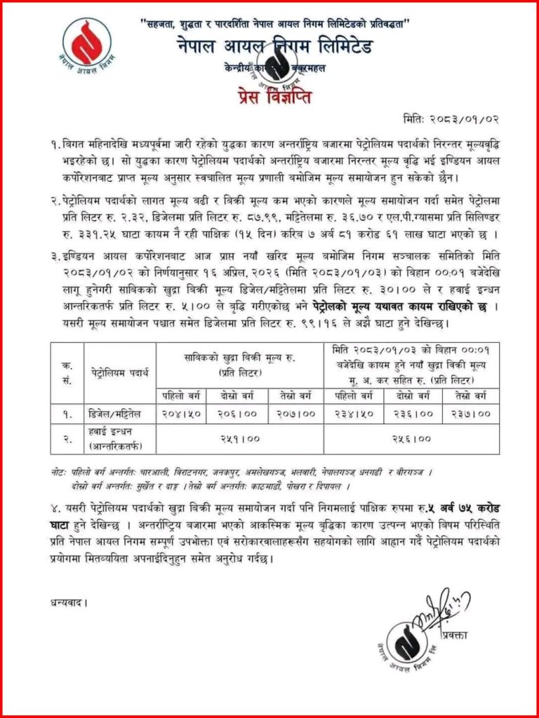 नयाँ मूल्यअनुसार डिजेल र मट्टितेलको मूल्य प्रतिलिटर ३० रुपैयाँले बढाइएको छ। त्यस्तै, आन्तरिक हवाई इन्धनको मूल्य पनि प्रतिलिटर ५ रुपैयाँले वृद्धि गरिएको छ। पेट्रोलको मूल्य भने यथावत् राखिएको निगमले जनाएको छ।