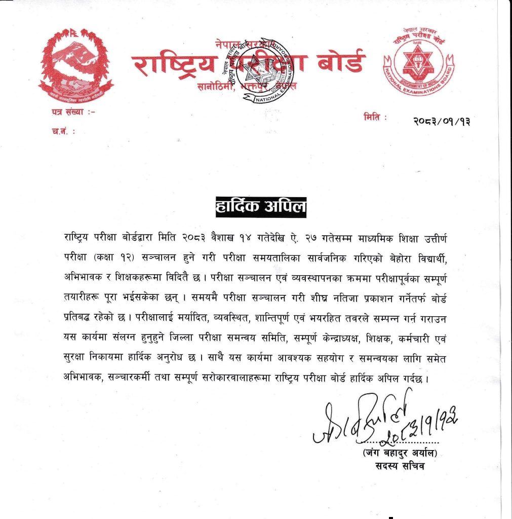 बोर्डका सदस्य सचिव जङ्ग बहादुर अर्यालद्वारा हस्ताक्षरित अपिलमा परीक्षालाई मर्यादित, व्यवस्थित, शान्तिपूर्ण र भयरहित वातावरणमा सम्पन्न गराउन सरोकारवालाहरूसँग सहयोगको माग गरिएको छ। बोर्डले परीक्षा लगत्तै नतिजा प्रकाशन गर्ने लक्ष्य राखेको समेत जनाएको छ।