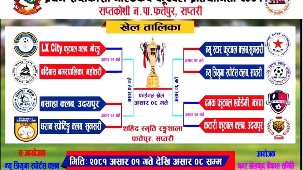 खगेन्द्र कार्की / फत्तेपुर, ३१ जेठ । सप्तरीको सप्तकोसी नगरपालिका १ फत्तेपुरमा प्रथम सप्तकोसी गोल्डकप फुटबल प्रतियोगिता असार १ गते देखि शुरु हुने भएको छ । सप्तकोसी नगर खेलकुद बिकास समितिको आयोजना र न्यु त्रियुगा स्पोर्ट्स कल्ब फत्तेपुरको सह आयोजनामा फत्तेपुरमा रहेको सहिद स्मृति रंगशालामा...