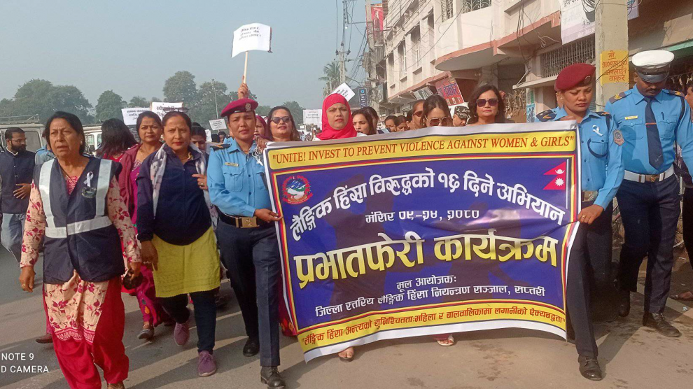 कञ्चनरुप, ९ मंसिर । सप्तरीको सदरमुकामसहित विभिन्न स्थानीय तहमा लैङ्गिक हिंसाविरुद्ध १६ दिने अभियान सुरु भएको छ । शनिबार प्रभातफेरी र र्याली, कोणसभा र अन्तरक्रियासहितको कार्यक्रम गरी लैङ्गिक हिंसाविरुद्ध १६ दिने अभियान सुरु भएको हो ।लैङ्गिक हिंसाविरुद्ध १६ दिने अभियान मूल आयोजक समिति...