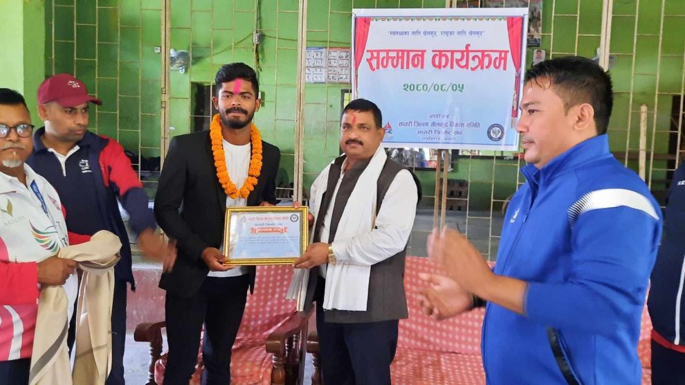 कञ्चनरुप, ५ मंसिर । नेपाल राष्ट्रिय क्रिकेट टोलीका खेलाडी विवेक कुमार यादवलाई एक कार्यक्रमबीच गृह जिल्ला सप्तरीमा सम्मान गरिएको छ ।नेपालले टी–२० विश्वकपमा स्थान बनाउँदा क्रिकेट खेलाडी यादवले उत्कृष्ट प्रदर्शन गरेको भन्दै सप्तरी जिल्ला खेलकुद विकास समिति तथा सप्तरी क्रिकेट संघले मंगलबार...