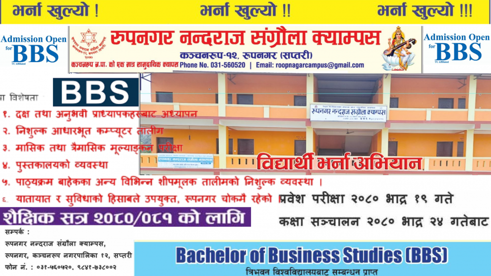 त्रिभुवन विश्वविद्यालयद्वारा मान्यता प्राप्त रूपनगर नन्दराज संग्रौला क्याम्पसको कार्यालयले चार वर्षे BBS तहमा भर्नासम्बन्धी सूचना प्रकाशित गरेको छ ।शैक्षिक सत्र २०८०/०८१ का लागि BBS तह (चार वर्षे) प्रथम वर्षमा नयाँ भर्ना खुलाएको हो । विद्यार्थीहरूले सम्बन्धित क्याम्पसमा आवेदन दिन सक्ने...