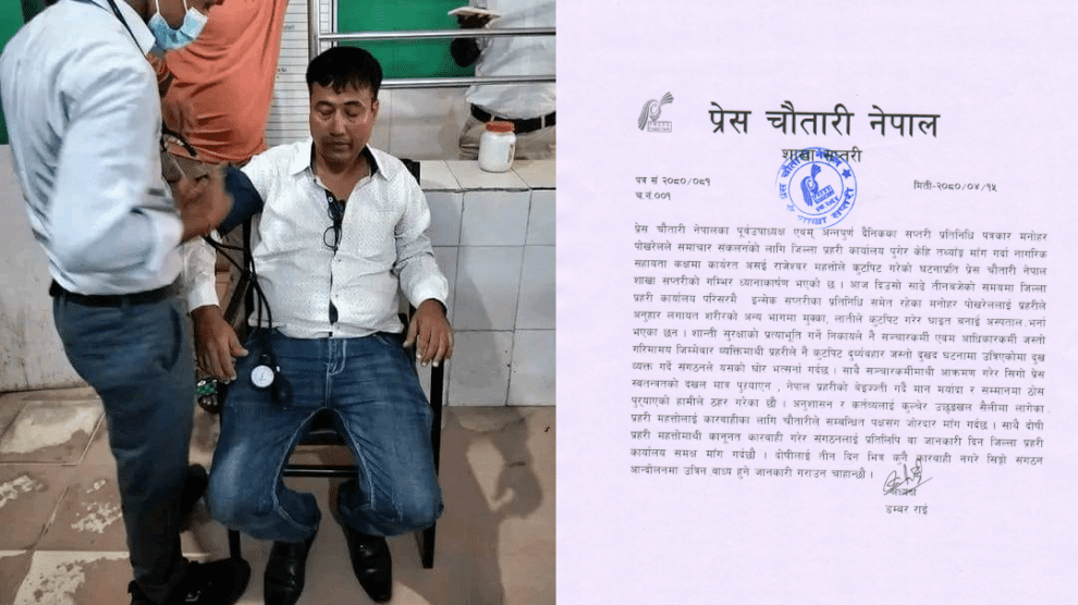 कञ्चनरुप, १५ साउन । प्रेस चौतारी नेपालका पूर्व केन्द्रीय उपाध्यक्ष एवम् नेपाल पत्रकार महासंघ सप्तरी शाखाका सल्लाहकार मनोहरकुमार पोखरेल माथी साउन १५ गते सोमबार जिल्ला प्रहरी कार्यालयमा भएको कुटपिट तथा दुर्व्यवहारको घटनाप्रति प्रेस चौतारी नेपाल शाखा सप्तरीको गम्भिर ध्यानाकर्षण भएको जनाएको छ...