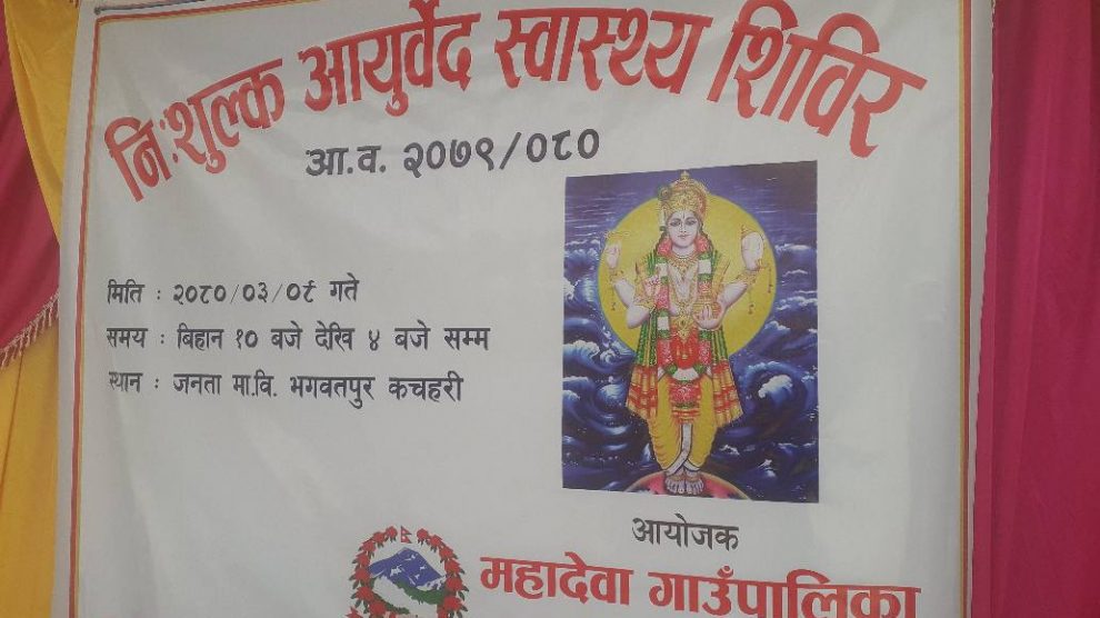 राजविराज, ९ असार । सप्तरीको महादेवा गाउँपालिकामा शनिवार निःशुल्क एक दिने आयुर्वैद स्वास्थ्य शिविर सम्पन्न भएको छ ।महादेवा गाउँपालिकाको आयुर्वैद शाखाको आयोजनामा वडा नम्बर ५ स्थित जनता माध्यमिक विद्यालय भगवतपुरमा एक समारोह विच प्रमुख अतिथी गापा अध्यक्ष सुनिलकुमार मण्डलले निःशुल्क एक दिने...