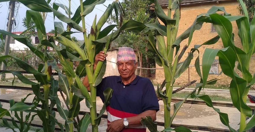 सुर्खेतको रहरपुरमा ४० वर्षदेखि कृषि पेसा गर्दै आएका बलिराज शर्माले लगाएको खेतबारीमा एउटै बोटमा ६ घोगा मकै देखाउँदै।