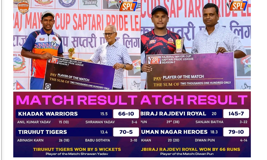 राजविराज, २८ असार । सप्तरीको राजविराजमा जारी सप्तरी प्राइड लिग अन्तर्गत शनिबार तेश्रो दिन सम्पन्न दुई वटा खेलमा तिरहुत टाइगर्स र राजविराज राजदेवी रोयल्स विजयी भएका छन् । पहिलो खेलमा तिरहुत टाइगर्सले खडक वारियर्सलाई पराजित गर्दै लगातार दोश्रो जित दर्ता गरेको छ । पबी स्कुल मैदानमा सम्पन्न...