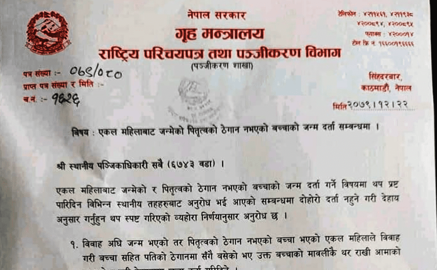 काठमाडौँ । एकल आमाका सन्तानको मावलीकै थर राखेर जन्म दर्ता हुने भएको छ ।राष्ट्रिय परिचयपत्र तथा पञ्जीकरण विभागले स्थानीय तहका सबै ६ हजार ७४३ वटै वडा कार्यालयलाई परिपत्र गर्दै एकल महिलाबाट जन्मेका तथा पितृत्वको ठेगान नभएका बच्चाको मावलीकै थर राखेर जन्म दर्ता गर्न निर्देशन दिएको हो ।यस्तो छ...