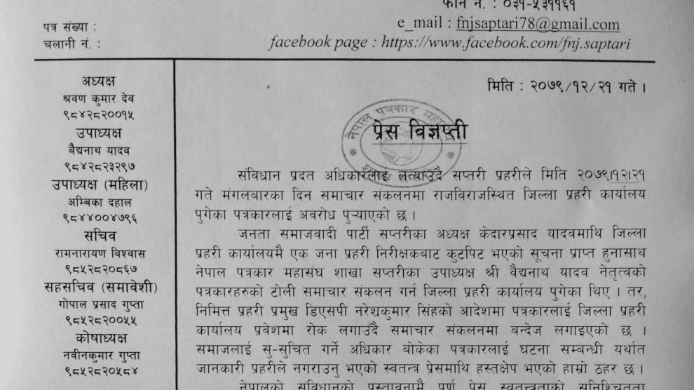 राजविराज । जिल्ला प्रहरी कार्यालय सप्तरीले पत्रकारहरुलाई समाचार संकलनमा अवरोध पु¥याएको भन्दै नेपाल पत्रकार महासंघ सप्तरी शाखाले एक विज्ञप्ति जारि गर्दै घटनाप्रति खेद व्यक्त गरेको छ ।नेपाल पत्रकार महासंघ सप्तरीले मंगलबार एक प्रेस विज्ञप्ति जारी गर्दै पत्रकारलाई समाचार संकलनमा अबरोध गर्ने...