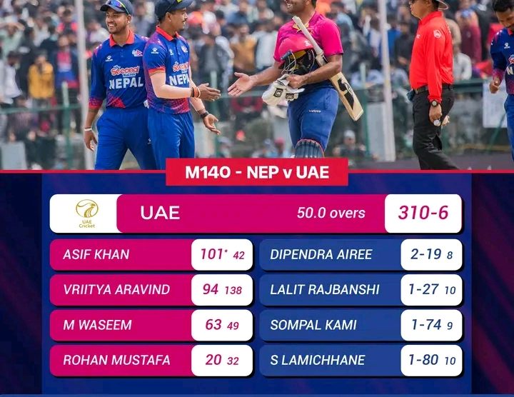 काठमाण्डाै । आईसीसी विश्व कप क्रिकेट लिग–२ को त्रिदेशीय एकदिवसीय शृङ्खलामा यूएईसँगको खेल जित्न नेपालले तीन सय ११ रनको विशाल लक्ष्य पाएको छ ।कीर्तिपुर मैदानमा टस जितेर पहिले ब्याटिङ गरेको यूएईले ५० ओभरमा ६ विकेट गुमाएर ३ सय १० रन बनायो ।उसका लागि आशिफ खानले १ सय १ रन बनाए । उनले ४० बलमै...