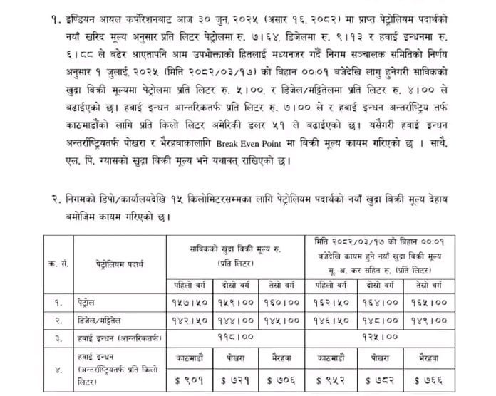काठमाडौं । पेट्रोलियम पदार्थमा उच्च मूल्यवृद्धि भएको छ । नेपाल आयल निगमले मंगलबारबाट लागू हुने गरी पेट्रोलमा ५ रुपैयाँ र डिजेल तथा मट्टितेलमा ४ रुपैयाँ मूल्य बढाएको हो ।