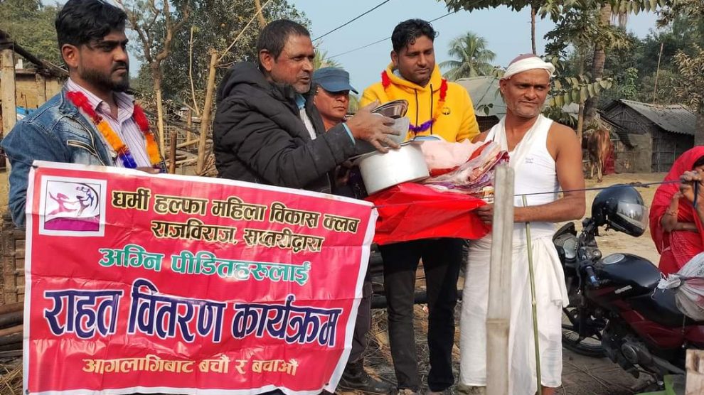 राजविराज, १७ पुस । धर्मिहल्फा महिला विकास क्लब सप्तरीद्वारा बोदेबरसाईन नगरपालिका ४ सिलहटमा आइतबार एक अग्निपीडित परिवारलाई राहात वितरण गरेको छ । स्थानीय सकल देव राउत गड़ेरियालाई राहत स्वरुप भाँडाकुँडा, लत्ताकपडा लगायतका सामग्री प्रदान गरेको हक्लबका अध्यक्ष सामाजसेवी ईन्जिनियर सूर्य नारायण...
