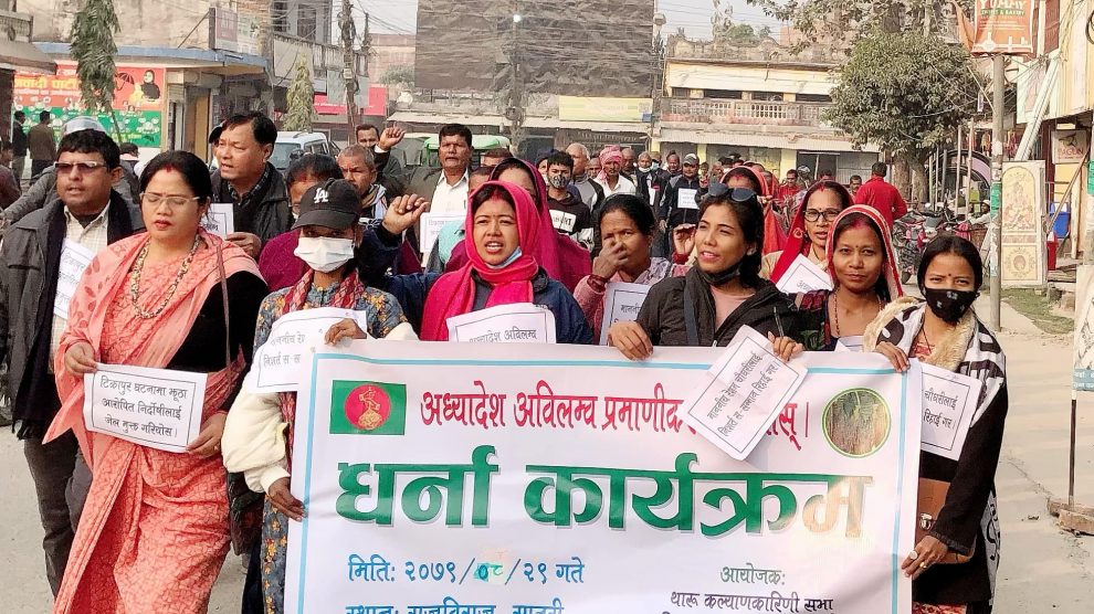 राजविराज, २९ मङ्सिर । सरकारले ल्याएको अध्यादेश अविलम्ब प्रमाणीकरण गरियोस भन्दै बिहीबार विभिन्न थारु संघसंस्थाले जिल्ला प्रशासन कार्यालय सप्तरीमा धर्ना दिएका छन् ।रेशम चौधरीसहित थरुहट आन्दोलनका योद्धाहरुलाई रिहाई गर्ने उद्देश्यले सरकारले ल्याएको अध्यादेशलाई अविलम्ब प्रमाणीकरण गर्न माग...