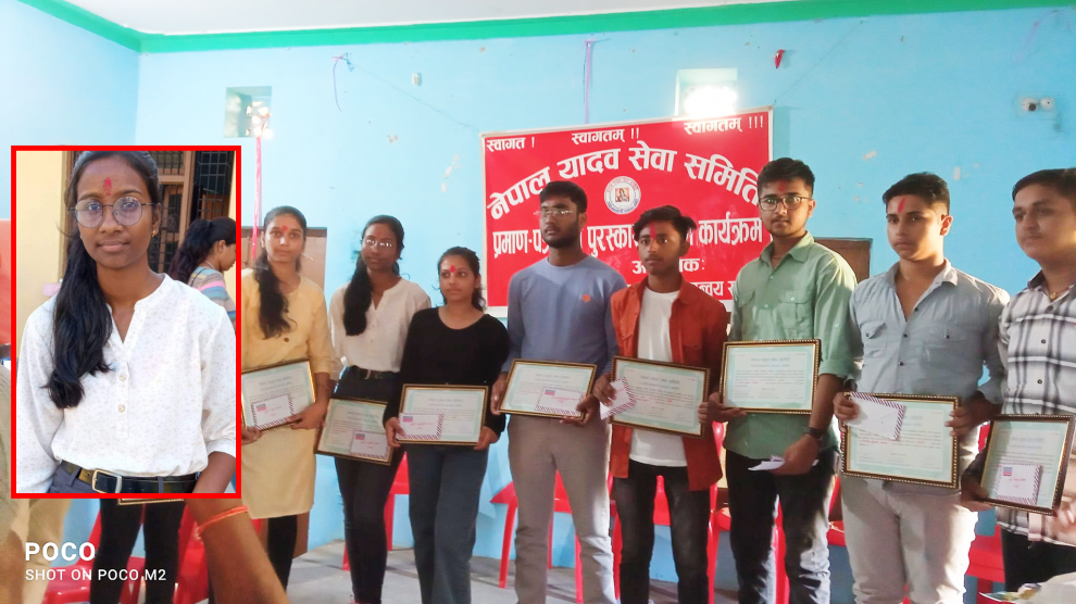सप्तरी । नेपाल यादव सेवा समितिले शुक्रबार एक कार्यक्रम विच उत्कृष्ट अंक ल्याउने छात्र-छात्रालाई पुरस्कार सहित सम्मान गरेको छ।सप्तरी काठमाडौं समन्वय समितिद्वारा स्वजातिय समुदायका २०७९ को एसईई परिक्षामा ए प्लस ल्याएर उत्तीर्ण भएका छात्र छात्रालाई सम्मान तथा पुरस्कार प्रदान गरिएको...
