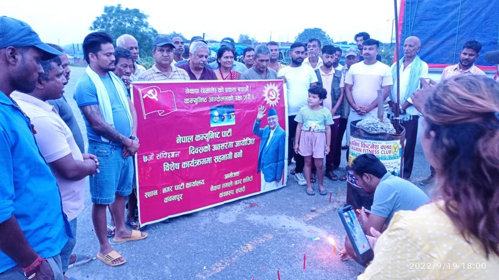 कञ्चनरुप, ३ असोज । संघीय गणतन्त्र नेपालको संविधान जारी भइ आठौं वर्षमा प्रवेश गरेको अवसरमा आज देशैभरी उल्लासका साथ संविधान दिवस मनाइएको छ । स्थानीय तहदेखि प्रदेशस्तरीय विभिन्न कार्यक्रम आयोजना गरि यो दिवस मनाइएको हो ।सप्तरीको कञ्चनरुप नगरपालिका स्थित रुपनगर चौकमा नेकपा एमालेले मैनबत्ती...