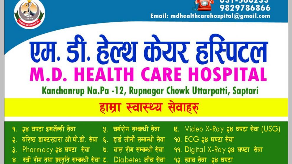 कञ्चनरुप । एम.डी. हेल्थ केयर हस्पिटल प्रालिले आफ्नो सेवा सप्तरीको कञ्चनरुप नगरपालिका वडा नम्बर १२ स्थित रुपनगरमा सबै किसिमको उपचार सेवा सञ्चालन गर्दै आएको छ। यस अस्पतालमा सबै किसिमको उपचार सेवा पाउन सकिने अस्पतालले जनाएको छ।अस्पतालबाट २४ सैं घण्टा सेवा लिन सकिने संचालक जाकिर शेखले बताए ।...