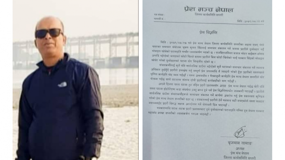 राजविराज, १९ साउन । प्रेस मञ्च सप्तरीद्वारा मञ्चका कार्यसमिति सदस्य भूषण कुमार सिँहलाई सामाचार संकलन गर्ने क्रममा दुर्व्यवहार गर्दै मोवाइल खोस्ने प्रहरीमाथी कारबाहीको माग गरेको छ ।प्रेस मञ्च नेपाल सप्तरीका अध्यक्ष बृजमान तामाङले बिहिवार एक प्रेस विज्ञप्ति जारी गर्दै पत्रकार सिंहमाथी...