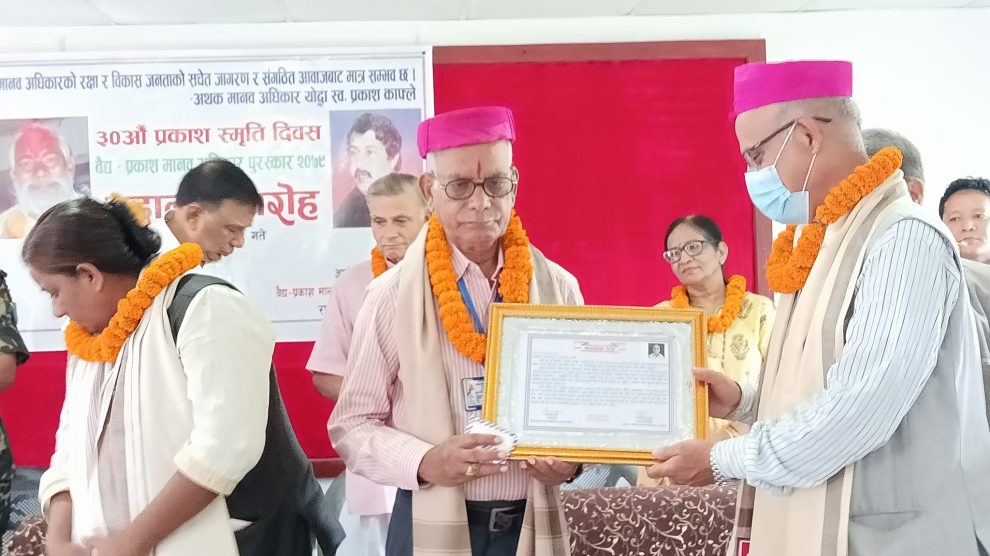 राजविराज, साउन १६ गते । शैक्षिक र सामाजिक जागरणको अभियानमा अविचलित रही योगदान पु¥याउनु हुने राजविराज नगरपालिका–५ का हितनारायण लाल दासलाई आज एक कार्यक्रमका बीच वैद्य–प्रकाश मानव अधिकार पुरस्कारबाट सम्मानित गरिएको छ ।प्रकाश काफ्लेको ३० औं स्मृति दिवसको अवसरमा राजविराजस्थित नेपाल पत्रकार...