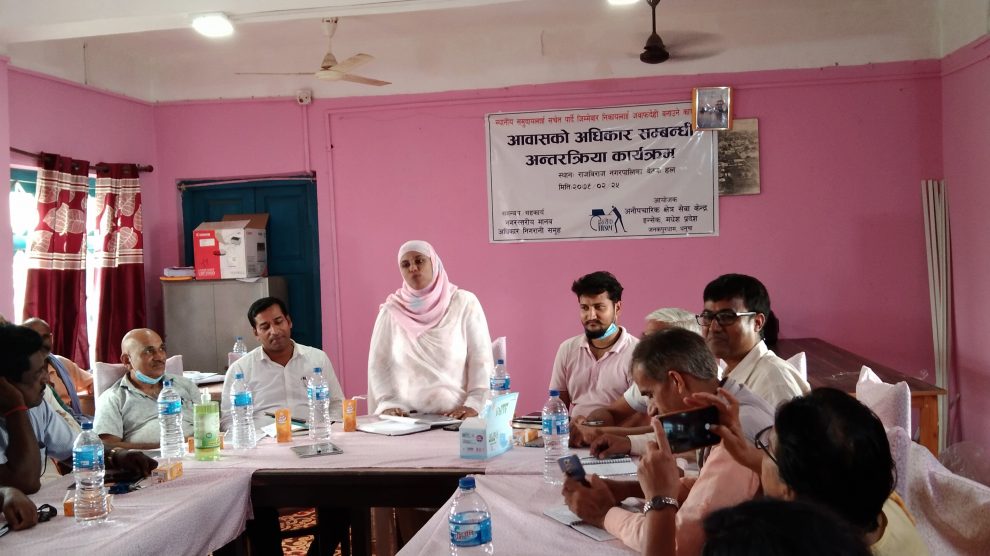 राजविराज, २६ जेठ । अनौपचारिक क्षेत्र सेवा केन्द्र (इन्सेक) मधेस प्रदेशको आयोजनामा राजविराजमा आवासको अधिकारबारे सरोकारवाला निकायसँग अन्तरक्रिया कार्यक्रम सम्पन्न भएको छ ।स्थानीय समुदायलाई सचेत पार्दै जिम्मेवार निकायलाई जबाफदेही बनाउने (इएलपी) परियोजना अन्तर्गत आवासको अधिकारबारे...