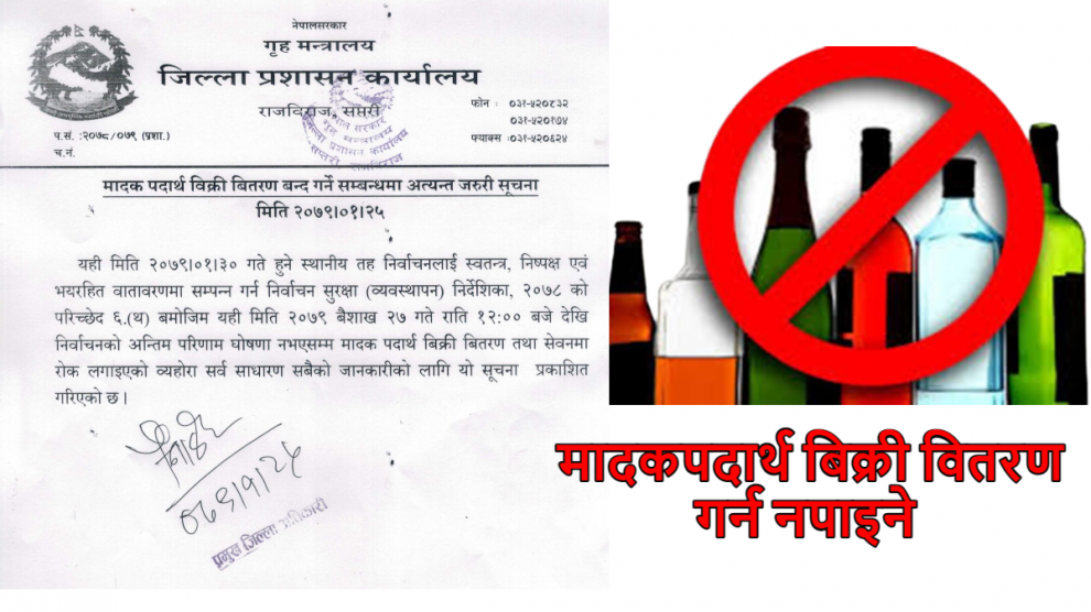 कञ्चनरुप, २५ वैशाख । जिल्ला प्रशासन कार्यालय सप्तरीले निर्वाचन अवधिभर मादक पदार्थ बिक्री वितरण तथा सेवन गर्न रोक लगाएको छ ।प्रशासनले आज आइतबार एक सूचना जारि गर्दै निर्वाचनलाई स्वच्छ, निश्पक्ष, भयरहित र शान्तिपूर्ण रूपमा सम्पन्न गर्नका लागि मादक पदार्थ बिक्री वितरण तथा सेवन गर्न रोक...