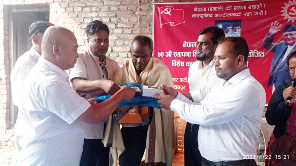 डम्बर राई कञ्चनरुप (सप्तरी), बैशाख ९ गते । पार्टीकै निम्ति २४ बर्ष अगाडी अपाङ्ग बनेका कञ्चनरुप ४ निवासी बुद्घशेन चौधरीलाई नेकपा एमालेले सम्झिएको छ । पार्टीको स्थापना दिवसको अवसरमा अपाङ्गता जीवन भोगिरहेका चौधरीलाई सम्मानार्थ सम्झिएको हो ।नगद पाँच हजार एक सय, सर्ट पेन्ट जुत्ता मोवाइल फोन १...