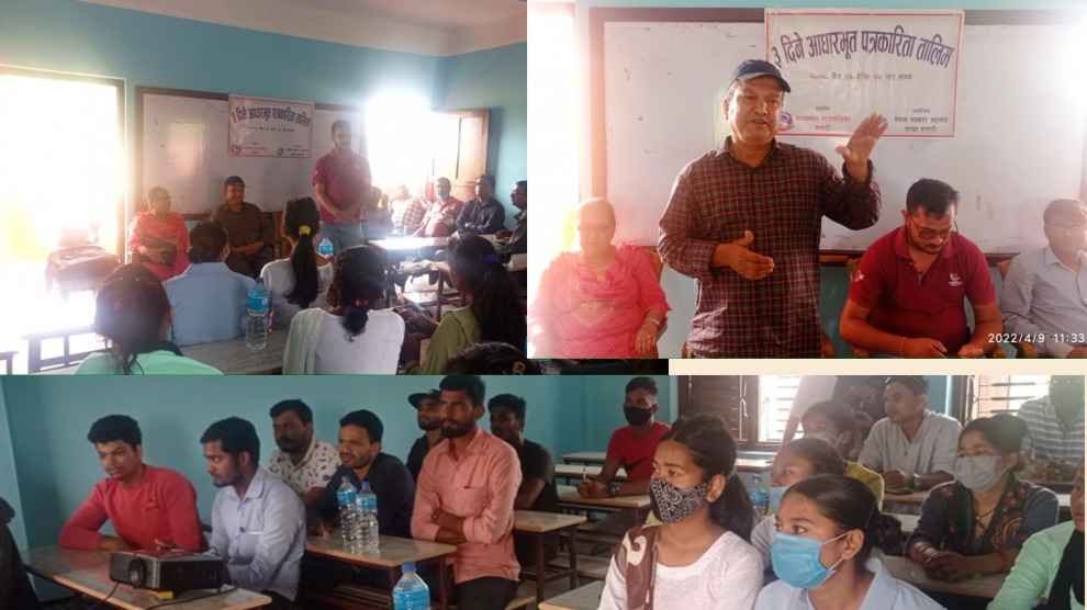 कञ्चनरुप, २६ चैत । नेपाल पत्रकार महासंघ सप्तरी शाखाको आयोजना तथा कञ्चनरुप नगरपालिकाको सहयोगमा शनिवारबाट रुपनगर नन्दराज संग्रौला क्याम्पस कञ्चनरुप १२ रुपनगरमा तीन दिने आधारभूत पत्रकारीता तालिम सुरु भएको छ ।सो कार्यक्रममा बोल्दै नगर प्रमुख बसन्त कुमार मिश्रले पत्रकारीता पेसा मर्यादित...