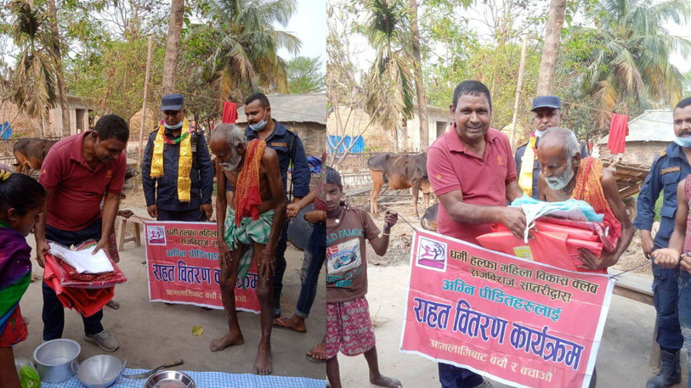 कञ्चनरुप, ९ चैत । धर्मी हल्फा महिला विकास क्लव सप्तरीले बिष्णुपुर गाउँपालिका ५ कट्टीका आगलागि पिडित परिवारलाई राहत वितरण गरेको छ ।संस्थाका अध्यक्ष एवम् समाजसेवी सूर्य नारायण यादवले अग्निपीडित खुशी लाल खंग खत्वेको परिवारलाई राहत प्रदान गरेका हुन ।यादवले राहत स्वरूप त्रिपाल ,झुल ,तन्ना...