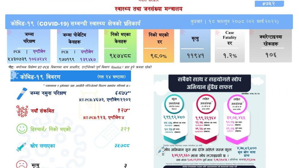 काठमाडौँ । नेपालमा आज १ सय २७ जनामा कोरोना संक्रमण पुष्टि भएको छ ।स्वास्थ्य तथा जनसङ्ख्या मन्त्रालयका अनुसार ६ हजार ८ सय ७४ नमुनाको पीसीआर परीक्षण गर्दा १ सय २७ जनामा संक्रमण पुष्टि भएको हो ।आज ३ सय २१ जना संक्रमित संक्रमणमुक्त भएका छन् ।आ ३ जना संक्रमितको मृत्यु भएको छ ।