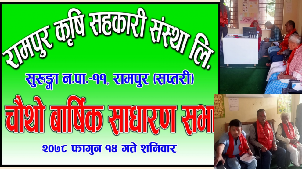 बृजमान तामाङ / विरेन्द्र बजार, १४ फागुन । सप्तरीको सुरुङ्गा नगरपालिका ११ मा अबस्थित रामपुर कृषि सहकारी संस्था लिमिटेड रामपुरको चौथो बार्षिक साधारणसभा सम्पन्न भएको छ । संस्थाका अध्यक्ष शिवशंकर चौधरीको अध्यक्षता तथा सुरुङ्गा नगरपालिका वडा नम्बर ११ का वडा अध्यक्ष गया प्रसाद चौधरीको प्रमुख...