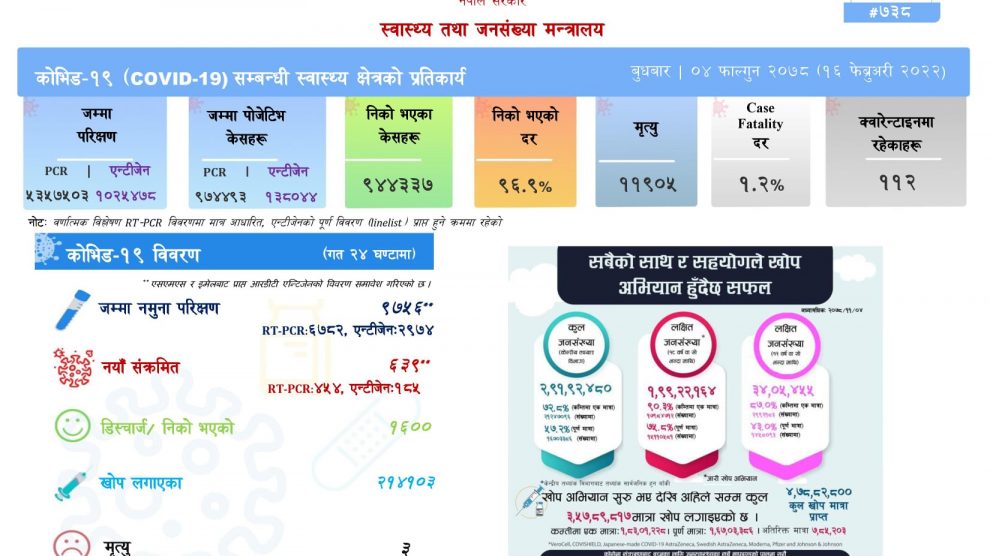 काठमाडौँ । नेपालमा आज थप ६ सय ३९ जनामा कोरोना संक्रमण पुष्टि भएको छ ।स्वास्थ्य तथा जनसङ्ख्या मन्त्रालयका अनुसार ६ हजार ७ सय ८२ नमुनाको पिसिआर परिक्षण गर्दा ५ सय ४८ र २ हजार ९ सय ७४ नमुना एन्टीजेन परिक्षण गर्दा १ सय ८५ जनामा संक्रमण पुष्टि भएको हो ।त्यस्तै आज १ हजार ६ सय संक्रमित निको भएका...