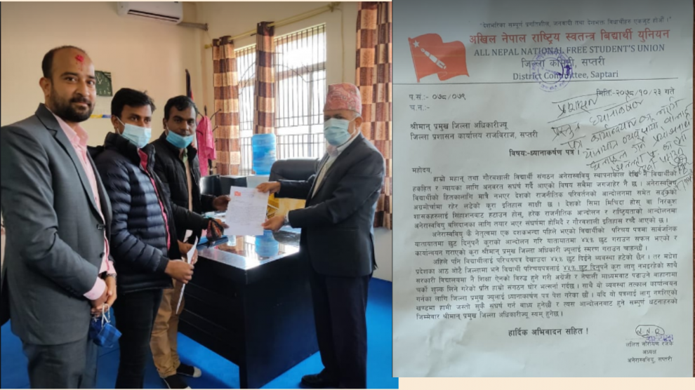 सप्तरी , २३ माघ । सार्वजनीक सवारीमा विद्यार्थी परिचयपत्रको आधारमा ४५ प्रतिशत छुट दिने व्यवस्था कार्यन्वयन गराउन अनेरास्ववियु सप्तरीले जिल्ला प्रशासन कार्यालय सप्तरीलाई ध्यानाकर्षण गराएको छ ।विगतमा लामो आन्दोलनपश्चात विद्यार्थी परिचय पत्रको आधारमा ४५ प्रतिशत छुट दिने व्यवस्था गरेपनि मधेश...