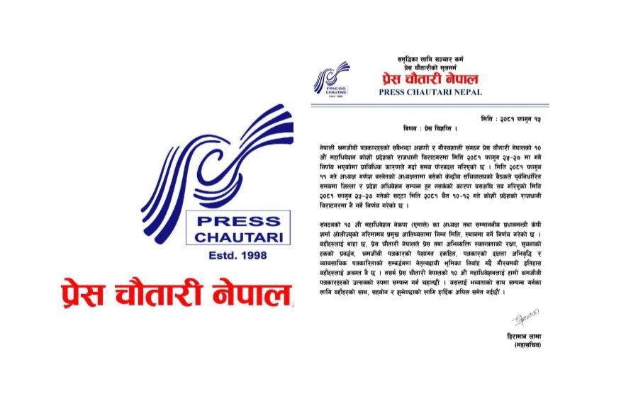कञ्चनरूप, १५ फागुन । प्रेस चौतारी नेपालको १० औं महाधिवेशनको मिति सरेको छ । फागुन २५ देखि २७ सम्म आयोजना गर्ने भनिएको महाधिवेशन चैत १० र १२ गते विराटनगरमा नै हुने भएको हो । चौतारीका अध्यक्ष गणेश बस्नेतको अध्यक्षतामा बसेको केन्द्रीय सचिवालयको बैठकले पूर्वनिर्धारित समयमा जिल्ला र प्रदेश...