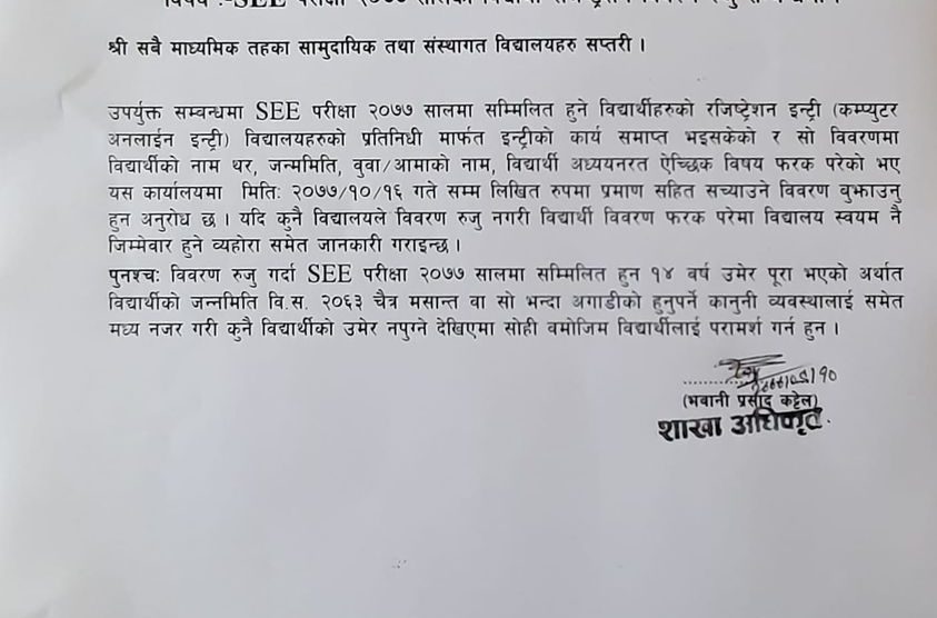 SEE परीक्षा २०७७ सालको विद्यार्थी रजिष्ट्रेशन विवरण रुजु सम्बन्धमा । सबै माध्यमिक तहका सामुदायिक तथा संस्थागत विद्यालयहरु सप्तरी । SEE परीक्षा २०७७ सालमा सम्मिलित हुने विद्यार्थीहरुको राजिष्ट्रेशन इन्ट्री (कम्प्युटर अनलाईन इन्ट्री) विद्यालयहरुको प्रतिनिधी मार्फत इन्ट्रीको कार्य समाप्त...