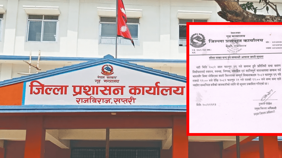 कञ्चनरुप, १३ फागुन । आसन्न फागुन २१ गते हुने प्रतिनिधि सभा सदस्य निर्वाचनलाई लक्षित गर्दै सप्तरीका भारतीय सीमा नाका तीन दिनका लागि बन्द गरिएको छ।जिल्ला प्रशासन कार्यालय...
