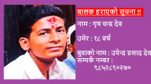 समाचार • समाज राजविराज-५ बाट १८ वर्षीय गृषचन्द्र देव हराएको सूचना ! सहयोग गरिदिनु होला २९ मंसिर २०८०, शुक्रबार २०:४१
